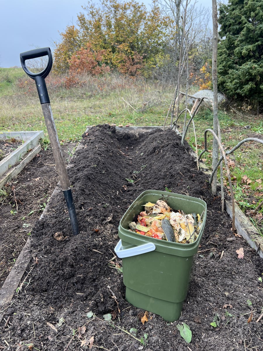 Både för vitlök och schalottenlök förbereder jag jorden med ny näring, i år grävde jag ner bokashi.